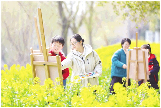 3月12日,江苏省海安市城南实验小学学生在老师指导下进行户外写生。