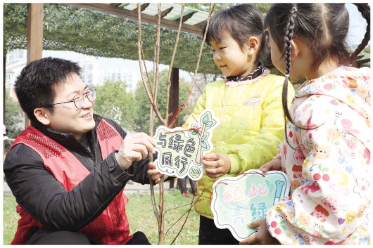 图为社区志愿者与小朋友一起为小区的树木挂上绿色宣传牌,引导大家增强爱绿护绿意识。
