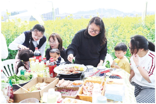 3月15日,游客在体验建德市更楼街道城南城市田园油菜花田里烤肉野餐。