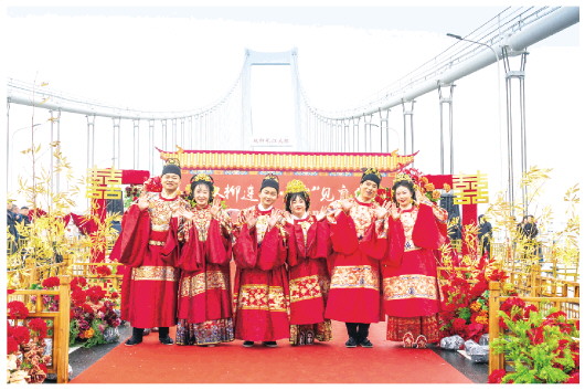 3月18日,在双柳长江大桥建设工地,新人在集体婚礼仪式现场合影。