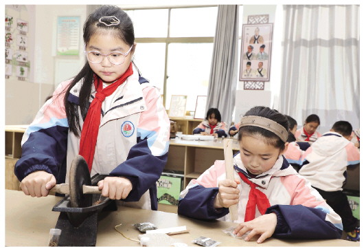 近日,清水河学校第三小学的几名学生在“本草课堂”社团课上,聚在一起辨识中药、碾制中药粉、分装香包的原料,教室里飘着淡淡的药草香。