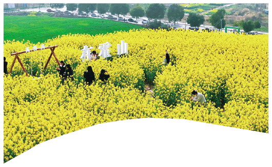 花田间游人如织,年轻情侣甜蜜留影,老人带孩子漫步田埂,三五好友流连花丛,欢声笑语回荡山野。