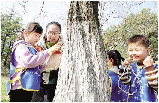 3月25日,裕安区海峡幼儿园开展“护绿天使 探秘自然”主题科普活动,小朋友们化身“护绿小天使”,在老师的带领下走出教室来到公园,开启别开生面的自然探索之旅,在聆听大树心跳、观察树皮纹理、学习环保知识等科普小课堂中探秘自然,感知生命,爱护环境,让绿色信念在童心中生根发芽。