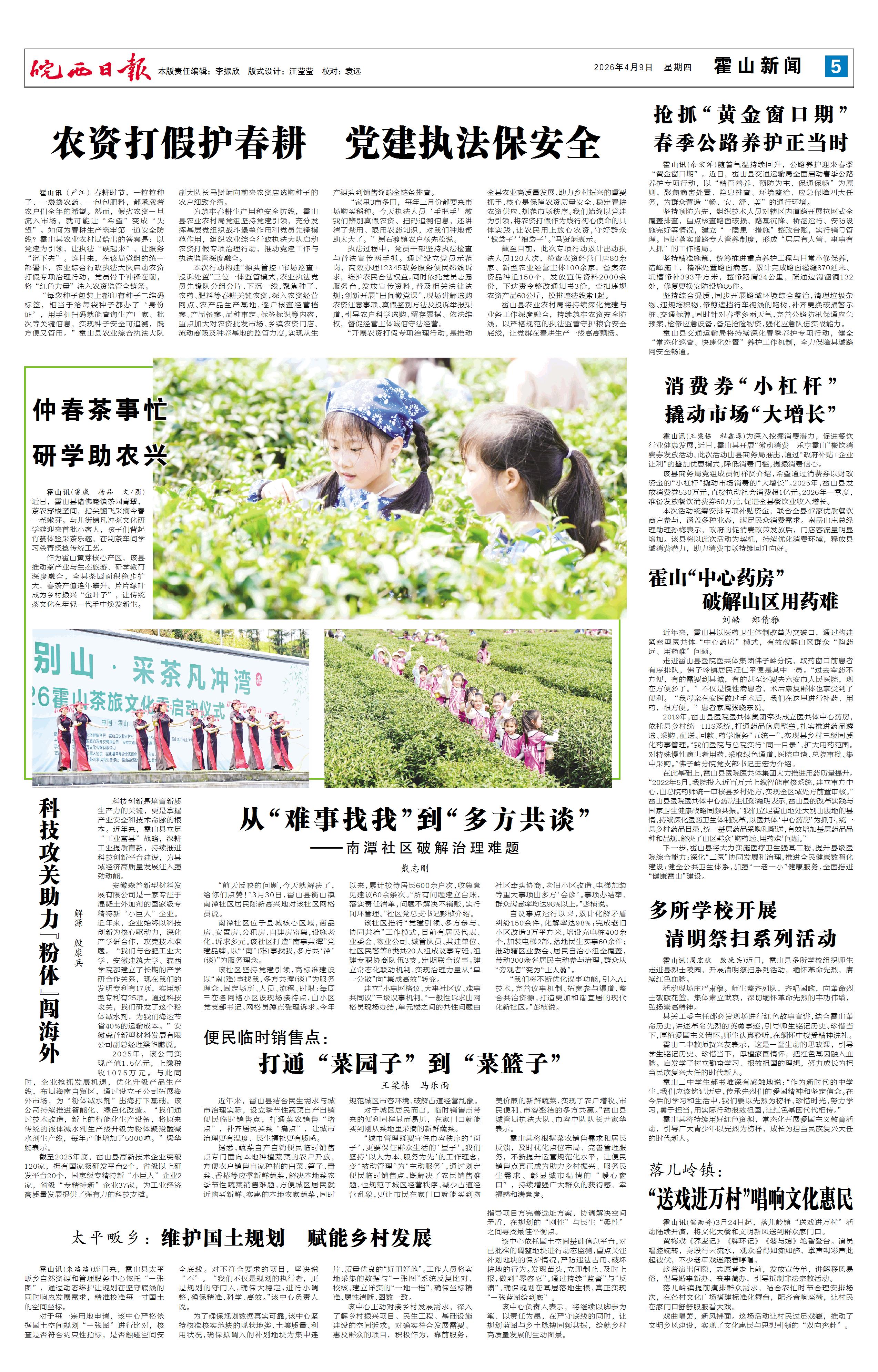 戴志刚 “前天反映的问题,今天就解决了,给你们点赞!”3月30日,霍山县衡山镇南潭社区居民陈新高兴地对该社区网格员说。 南潭社区位于县城核心区域,商品房、安置房、公租房、自建房密集,设施老化,诉求多元。该社区打造“南事共潭”党建品牌,以“‘南’(难)事找我,多方共‘潭’(谈)”为服务理念。 该社区坚持党建引领,高标准建设以“南(难)事找我,多方共潭(谈)”为服务理念,固定场所、人员、流程、时限:每周三在各网格小区设现场接待点,由小区党支部书记、网格员蹲点受理诉求。今年以来,累计接待居民600余户次,收集意见建议60余条次。“所有问题建立台账,落实责任清单,问题不解决不销账,实行闭环管理。”社区党总支书记彭桢介绍。 该社区推行“党建引领、多方参与、协同共治”工作模式,目前有居民代表、业委会、物业公司、城管队员、共建单位、社区民警等8类共20人组成议事专班,组建专职协商队伍3支,定期联合议事。建立常态化联动机制,实现治理力量从“单一分散”向“集成高效”转变。 建立“小事网格议、大事社区议、难事共同议”三级议事机制。“一般性诉求由网格员现场办结,单元楼之间的共性问题由社区牵头协商,老旧小区改造、电梯加装等重大事项由多方‘会诊’。事项办结率、群众满意率均达98%以上。”彭桢说。 自议事点运行以来,累计化解矛盾纠纷150余件,化解率达98%;完成老旧小区改造3万平方米,增设充电桩400余个,加装电梯2部,落地民生实事60余件;推动辖区业委会、居民自治小组全覆盖,带动300余名居民主动参与治理,群众从“旁观者”变为“主人翁”。 “我们将不断优化议事功能,引入AI技术,完善议事机制、拓宽参与渠道、整合共治资源,打造更加和谐宜居的现代化新社区。”彭桢说。