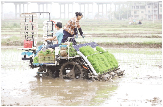 4月8日,在湖南省永州市道县梅花镇车头村,村民驾驶插秧机插早稻。